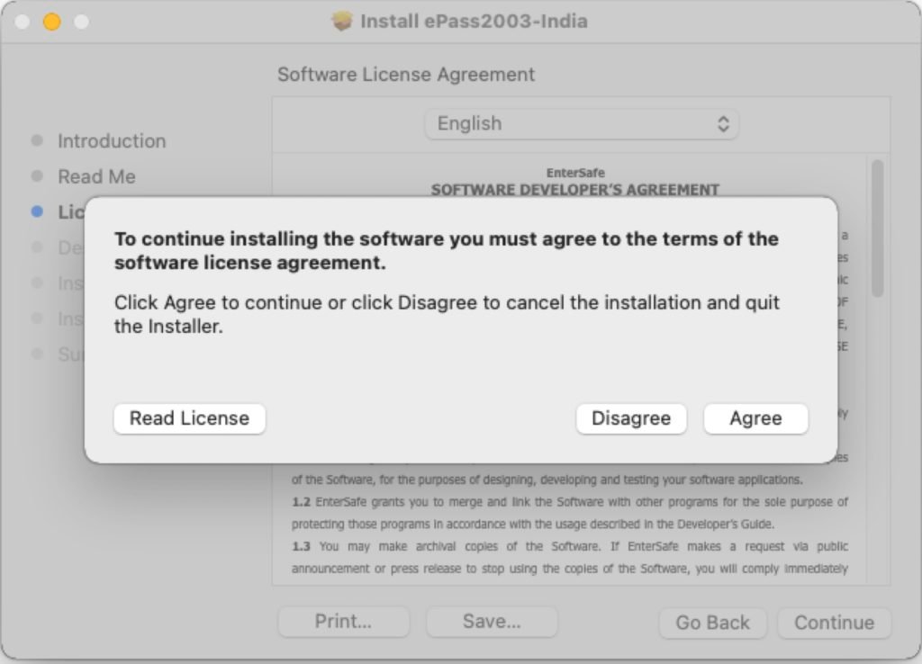 | Step 3: Disk Image package of ePass2003-India having the list of content 1. EnterSafeAdminMgr:- Manager Tool of Administrator version. 2. ePass2003-India-YYYYMMDD.pkg:- it will install EnterSafe middleware and manager. 3. License Agreement. 4. ReadMe.rtf:- Readme document. 5. uninstall.sh:- Uninstall Castle Mac. |